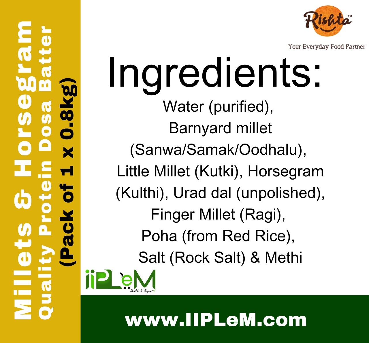 Ingredients: Water, Barnyard millet, Little Millet, Horsegram, Urad dal (unpolished), Finger Millet (Ragi), Poha (from Red Rice), Salt (Rock Salt) & Methi